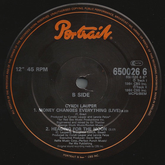 ℗ 1986 [A, B2, ℗ 1984 [B1 CBS Inc. © 1986 CBS Inc./"Portrait" and Portrait [logo™® CBS Inc. 3-track 12" Track A taken from the Portrait LP: "True Colors"PRT 26948. Track B1 produced for Red Sox Music Productions, Inc. and is a special live version from the Portrait LP "She's So Unusual" PRT 25792. Track A: Warner Brothers Music Limited Track B1: George Gluck Music/Rocket Music Track B2: Rellla Music Corp./Perfect Punch Music/Pet Me Publishing Distribution CBS Records/CBS Disques S.A. Made in England.