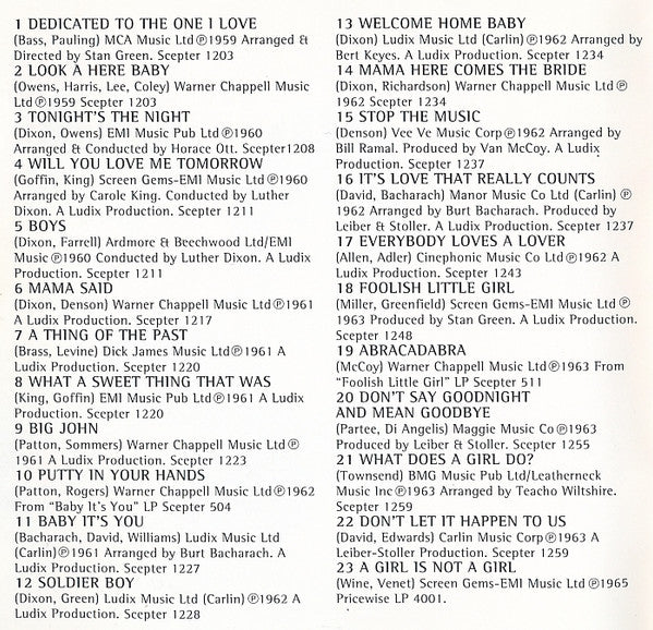 Released in standard jewel case with 8-page booklet. Track 1 published by MCA Music Ltd ℗ 1959 Track 2 published by Warner Chappell Music Ltd ℗ 1959 Track 3 published by EMI Music Pub Ltd ℗ 1960 Track 4 published by Screen Gems-EMI Music Ltd ℗ 1960 Track 5 published by Ardmore & Beechwood Ltd/EMI Music ℗ 1960 Tracks 6 & 9 published by Warner Chappell Music Ltd ℗ 1961 Track 7 published by Dick James Music Ltd ℗ 1961 Track 8 published by EMI Music Pub Ltd ℗ 1961 Track 10 & 14 published by Warner Chappell Music Ltd ℗ 1962 Track 11 published by Ludix Music Ltd (Carlin) ℗ 1961 Tracks 12 & 13 published by Ludix Music Ltd (Carlin) ℗ 1962 Track 15 published by Vee Ve Music Corp ℗ 1962 Track 16 published by Manor Music Co Ltd (Carlin) ℗ 1962 Track 17 published by Cinephonic Music Co Ltd ℗ 1962 Track 18 published by Screen Gems-EMI Music Ltd ℗ 1963 Track 19 published by Warner Chappell Music Ltd ℗ 1963 Track 20 published by Maggie Music Co ℗ 1963 Track 21 published by BMG Music Pub Ltd/Leatherneck Music Inc ℗ 1963 Track 22 published by Carlin Music Corp ℗ 1963 Track 23 published by Screen Gems-EMI Music Ltd ℗ 1965 Track 24 published by BMG Music Pub Ltd/Ludix Music Ltd (Carlin) ℗ 1964 Track 25 published by Screen Gems-EMI Music Ltd ℗ 1964 Track 26 published by Handle Music Ltd ℗ 1964 Track 27 published by Warner Chappell Music Ltd/BMG Music Pub Ltd/Copyright Control ℗ 1964 Track 28 published by EMI Songs Ltd ℗ 1964 Track 29 published by Warner Chappell Music Ltd ℗ 1966 Track 30 published by Warner Chappell Music Ltd ℗ 1967 Track 31 published by BMG Music Pub Ltd/Vee Ve Music Corp ℗ 1967 Track 32 published by Pises/Hi-Mi/BMG Music Pub Ltd ℗ 1968 The copyright in this sound recording is owned by Netshare Ltd and is licensed to Ace Records Ltd ℗ Netshare Ltd. This Compilation ℗ 1992 Ace Records Ltd © 1992 Ace Records Ltd. Made in The UK.