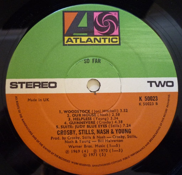 1st Pressing with soft textured embossed cover. No Warner Bros logo on label rim text. Recorded at Wally Heider's 3,Los Angeles, Wally Heider's C, San Francisco , Record Plant, Los Angeles. Compilation of tracks from the self-titled debut from Crosby, Stills & Nash, Déjà Vu by Crosby, Stills, Nash & Young plus the singles Ohio and Find the Cost of Freedom . Runouts are stamped with 'Porky' and 'Pecko' parts etched.