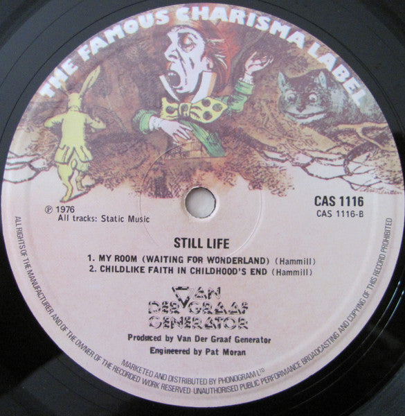 Original UK release in matte cover on 'mad hatter' labels. On cover rear: Recorded and mixed at Rockfield Studios between June 9-29, 1975 and January 12-25, 1976 and cut by Arun at CBS; Arun also did the final cut of 'Godbluff' [r540750 - time prevented due credit appearing among its notes. Marketed by Charisma Records Ltd., 70 Old Compton St., London W1. Colour reproduction by E.C.Graphics Limited Printed by James Upton Ltd., England On labels: ℗ 1976 All tracks: Static Music Marketed and distributed by Phonogram Ltd The runouts are stamped; 'ARUN' is etched.