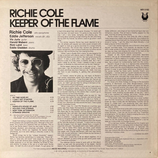 Recorded at Van Gelder Studio, Englewood Cliffs, N.J. - September 6, 1978 Special thanks to: Dick Hindman, Maria Kornhouser, Mark Murphy, Clyde Babb, Smith Dobson and Rudy Van Gelder. © ℗ 1979, Muse Records, a divison of Blanchris, Inc. ℗ 1979 Muse Records Cat# MR 5192 from cover, back, spine and both labels Cat# 0798 from spine Track A1 (Warner Bros. Music) ASCAP Track A2 (Chappell & Co., Inc.) ASCAP Tracks A3, B1, B3, B4 (Alto Madness Music) BMI Track B2 (Bregman, Vocco & Conn Inc.) ASCAP [Additional information: Glossy cover with generic white inner sleeve
