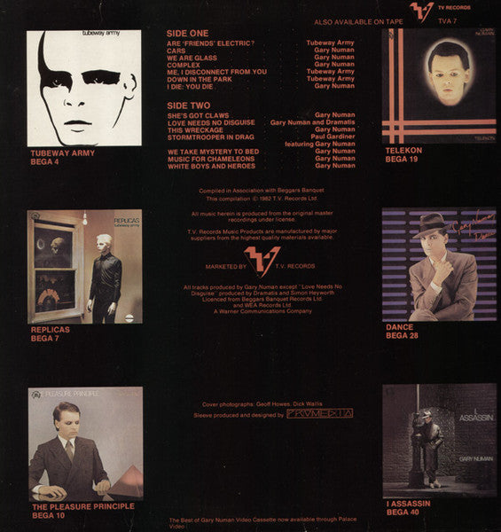 A1 ℗ 1979 Beggars Banquet. Published by Beggars Banquet Music Ltd. A2 ℗ 1979 Beggars Banquet. Published by Beggars Banquet Music Ltd. A3 ℗ 1980 Beggars Banquet. Published by Numan Music Ltd. A4 ℗ 1979 Beggars Banquet Published by Beggars Banquet Music Ltd. A5 ℗ 1979 Beggars Banquet Published by Beggars Banquet Music Ltd. A6 ℗ 1979 Beggars Banquet Published by Beggars Banquet Music Ltd. A7 ℗ 1980 Beggars Banquet. Published by Numan Music Ltd. B1 ℗ 1981 Beggars Banquet. Published by Numan Music Ltd. B2 ℗ 1981 A Rocket Records Recording. Published by Songwriters Workshop / Rocket Music Ltd. B3 ℗ 1980 Beggars Banquet. Published by Numan Music Ltd. B4 ℗ 1981 Beggars Banquet. Published by Numan Music Ltd. B5 ℗ 1982 Beggars Banquet. Published by Numan Music Ltd. B6 ℗ 1982 Beggars Banquet. Published by Numan Music Ltd. B7 ℗ 1982 Beggars Banquet. Published by Numan Music Ltd. B8 ℗ 1982 Beggars Banquet. Published by Numan Music Ltd. This compilation © 1982 T.V. Records Ltd. There is another TVA 7 release of '[r=14004457' that version is the Ireland release with the double dip centres. All other versions have completely different cat. No.s Track times not given on release.