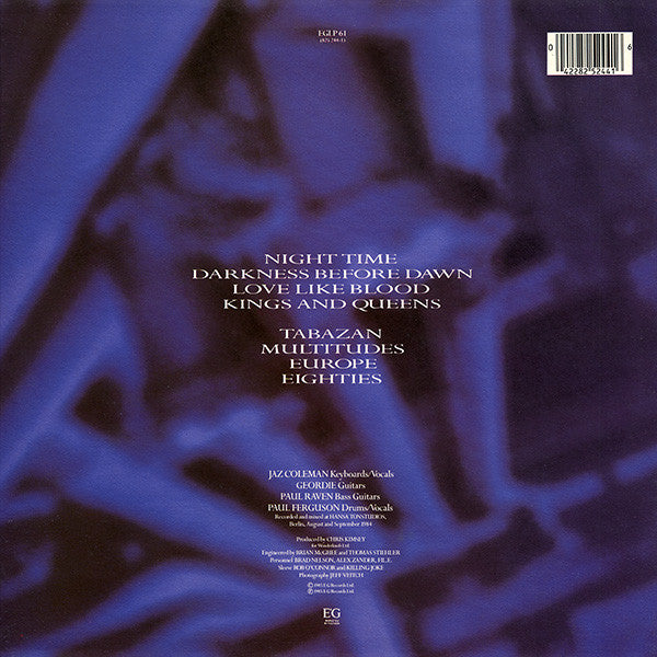 Runouts are stamped. ARUN is etched. Recorded and mixed at Hansa Tonstudios, Berlin, August and September 1984 Includes printed black & silver inner sleeve with lyrics. Catalog #: EGLP61 (Spine, Back Cover, Inner Sleeve, & Labels) 825 244-1 (Back Cover, Inner Sleeve, & Labels) Logos: EG (Back Cover & Labels) Polydor (Labels) © EG Music Ltd 1985 © 1985 EG Records Ltd. ℗ 1985 EG Records Ltd.