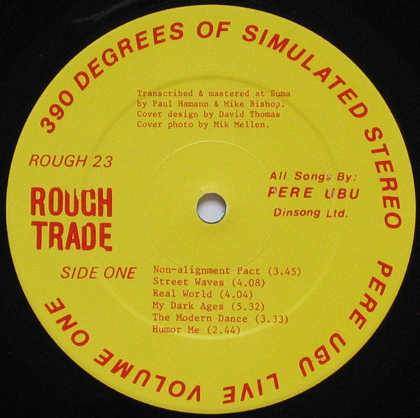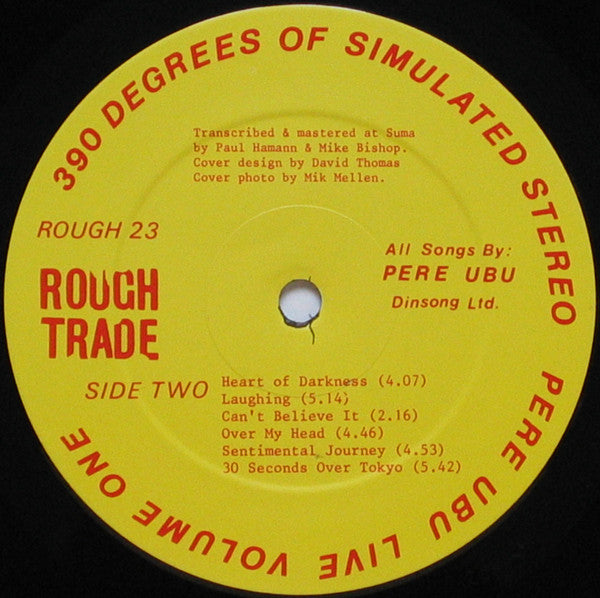 Album title on center labels: "390 Degrees Of Simulated Stereo Pere Ubu Live Volume One" Subtitle on front: "Pere Ubu in Cleveland, London & Brussels. B3-B5 recorded May '76 at The Mistake in Cleveland on a portable cassette machine. B6 recorded August 4 '77 at Pirate's Cove in The Flats, Cleveland on a reel-to-reel A6 recorded October 14 '77 at Ubu rehearsal loft in Cleveland on one channel of a reel-to-reel A3, A4 recorded February 18 '78 at Disasto 2, WHK Auditorium in Cleveland on a reel-to-reel A2 recorded May 5 '78 at Theater 140 in Brussels A1, B2 recorded December 5 '78 at College of Printing in London by a mobile recording unit B1 recorded December 6 '78 at Brunel University in Uxbridge by a mobile recording unit A5 recorded March 2 '79 at International Garage Exhibition, Cleveland State University on a portable cassette machine