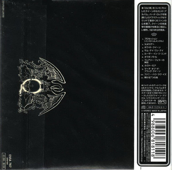 Comes in a CD sized papersleeve album replica in a gatefold cover, with obi-strip, printed inner-sleeve and insert of notes mostly in Japanese. Digital remasters Ⓟ2001. The copyright in the sound recording is owned by Queen Productions Ltd. under exclusive license to EMI Records Ltd. ©2001 Queen Productions Ltd.
