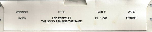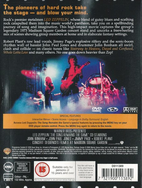 Region 2. Duel Layer Format. Wide Screen; 1.85.1 Colour - PAL - 132 Mins. Approx Front Sleeve States: Led Zeppelin The Song Remains The Same. In Concert and Beyond.
