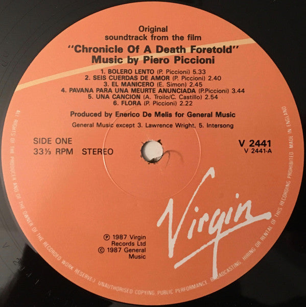 Piero Piccioni - Chronicle Of A Death Foretold (Original Soundtrack From The Film) (LP, Album) (Very Good Plus (VG+))