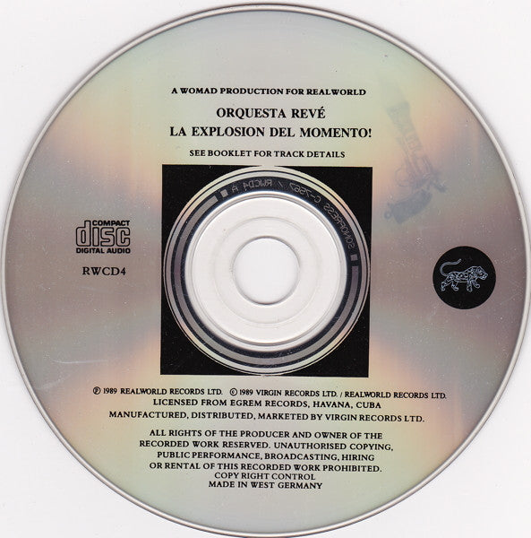 "Elio Revé and his band play Cuba's most exciting dance music - the sound of son-chagüi" Tracks 1, 3, 12 from Rumberos Latino Americano (EGREM LD 4320) Tracks 4, 6, 8, 10 from La Explosion del Momento (EGREM LD 4413) Tracks 2, 5, 7, 9, 11 from Que Cuento Es Ese! (EGREM LD 4494) Track 6 credited with copyright notice D.R. Licensed from Egrem Records, Havana, Cuba. ℗ 1989 Realworld Records Ltd. (incorrectly credited Virgin Records Ltd. on back cover) © 1989 Virgin Records Ltd./Realworld Records Ltd. Made in West Germany Standard jewel case with brown tray including a 12-page booklet
