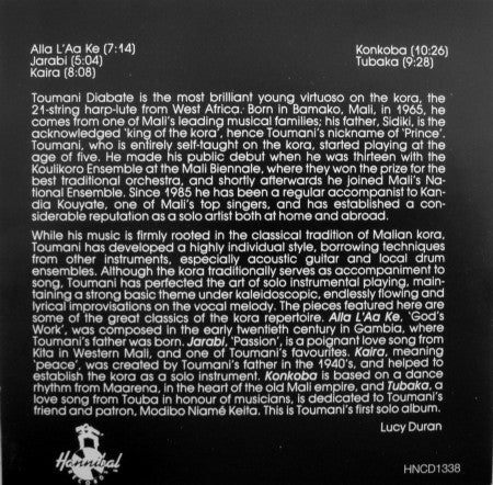 Kora music from Mali, Africa. This is Toumani's first solo album. This recording was made entirely live and unaccompanied by Toumani Diabate. There is no double tracking and there is no accompaniment by another Kora. Recorded in October 1987, Firehouse Studio, London. Cover design derived from Mandinka cotton robe (Liberia) courtesy of the Museum of Mankind. ℗ & © 1988 Rykodisc Ltd.