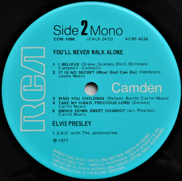 According to the US number in brackets (CALX 2472) and the matrix numbers, ACRS-4523 and ACRS-4524, on the labels this is a stereo and mono release, as the US original, where the 1950´s recordings are in mono and the 1960´s recordings are in stereo. But, despite the numbers, on this release all songs are in mono. Also Swing Down Sweet Chariot is the 1960 recording and not the October 23, 1968 recording from the movie The Trouble With Girls. Camden is in smaller letters on the labels and the composer´s names are on the same line as the song. Plus the "Manufactured by RCA..." on the labels are different. Artwork difference, this release has Hyde Industrial Estate on rear artwork