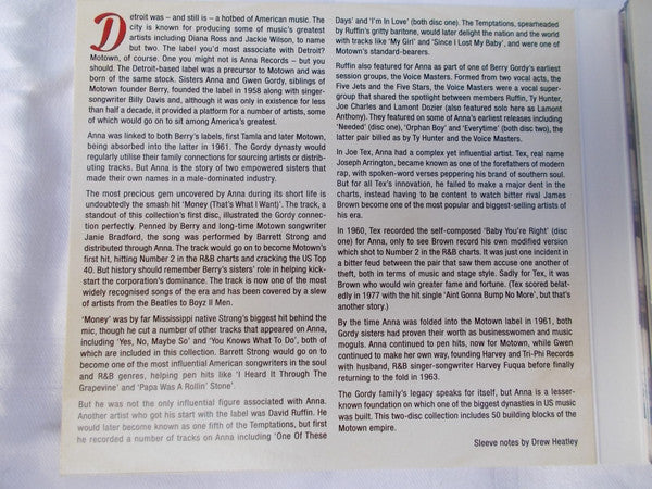 Collection of Anna & Gwen Gordys short lived "Anna Records"-Label in Detroit. All selections originally recorded and released between 1959 and 1961. The label Anna Records was absorbed by Berry Gordy's Motown in 1961.