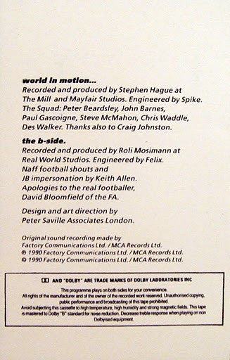 There is another UK cassette with a slightly different tape design --> [r=9306039 A1, B1 recorded and produced at The Mill and Mayfair Studios. A2, B2 recorded and produced at Real World Studios. Original sound recording made by Factory Communications Ltd/MCA Records Ltd. ℗ 1990 Factory Communications Ltd/MCA Records Ltd. © 1990 Factory Communications Ltd/MCA Records Ltd. Cassette plays same tracks on both sides. Thanks also to Craig Johnston Apologies to the real footballer, David Bloomfield of the FA.