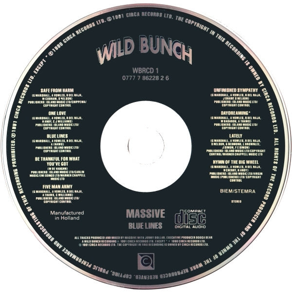 Recorded at: Coach House, Bristol: tracks 1, 2, 6, 8 and 9. Eastcote Studios, London: tracks 3 and 5. Cherry Bear Studios: tracks 4 and 7. Abbey Road, London: track 6. Hot Nights, London: track 9. Mixed At: Matrix, London: tracks 1, 4, 5, 6 and 9. Konk Studios, London: tracks 2 and 7. Roundhouse, London: track 7. Coach House, Bristol: track 8. Publishers [Sleeve credits: Island Music Ltd / Screen Gems EMI Music Ltd: track 1. Island Music Ltd / Copyright Control: tracks 2, 3, 5, 6 and 7. Island Music Ltd / Carlin Music Corp / EMI Songs Ltd / Warner Chappell: track 4. Island Music Ltd / Copyright Control / Warner Chappell Music Ltd: track 8. Island Music Ltd / Virgin Music (Publishers) Ltd / Copyright Control: track 9. Publishers [Disc credits, where different: Island Music Ltd / Chippewa / Copyright Control: track 1 Island Music Ltd / Carlin Music / EMI Songs Ltd / Warner Chappell Music Ltd: track 4 A Wild Bunch recording. ℗ 1991 Circa Records Ltd. except track 7 ℗ 1990 Circa Records Ltd. © 1991 Circa Records Ltd. The copyright in this recording is owned by Circa Records Ltd. UK: WBRCD 1 Printed in Holland. Manufactured In Holland. Issued in a standard jewel case with twenty-four page booklet. Track 8 samples 'Mellow Mellow (Right On)' by Lowrell. Some copies may have a 'Mid-Price' sticker on front cover/jewel case.