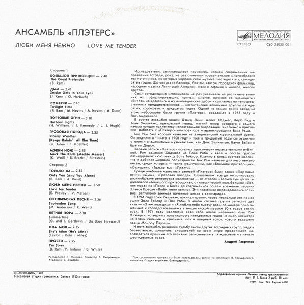 (с) "Мелодия", 1987 Всесоюзная студия грамзаписи. Запись 1950-х г. Апрелевский ордена Ленина завод грампластинок Арт. 11-1. Цена 2 руб. 50 коп. 1989 Зак. 245. Тираж 6500
