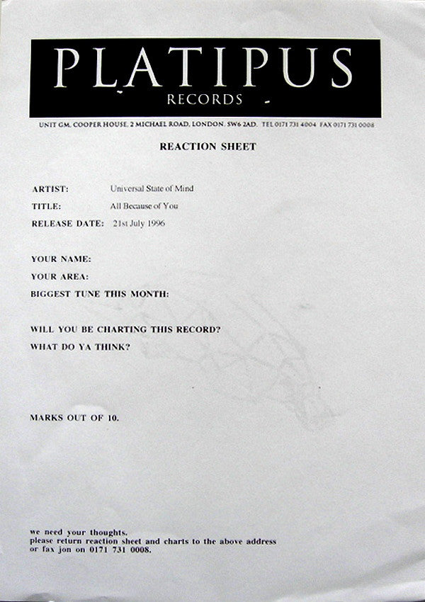 Universal State Of Mind - All Because Of You (12") (Very Good Plus (VG+))