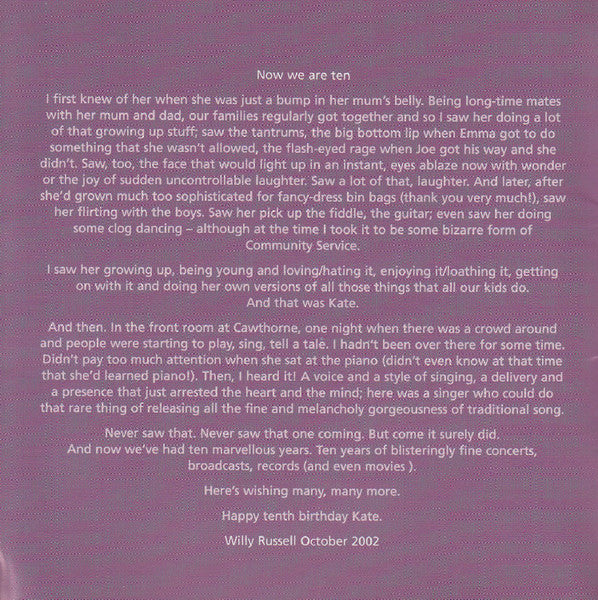 © Pure Records 2002 ℗ All tracks Pure Records 2002. Packaging: Standard jewel case, with transparent tray, and 16 page booklet. Recorded by Joe Rusby and Andy Seward at Pure Records Studio, Yorkshire Except tracks 12 and 15 recorded and mixed by Moray Munro at Temple Studio, Midlothian, and tracks 10 and 14 recorded live by Keith Angel. Tracks 1, 2 to 6, 8, 9 & 13 (new) 2002 recordings Track 7 taken from 401613 Track 11 taken from [r=6832464 Track 12 taken from [r=2334856 Track 15 taken from 344535 Tracks 10 & 14 recorded live by the Kate Rusby Band in September 2001 Kate plays a Peter Barton guitar