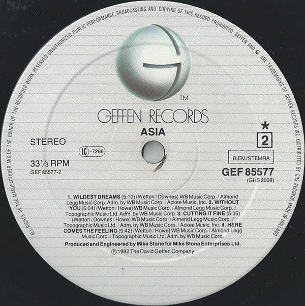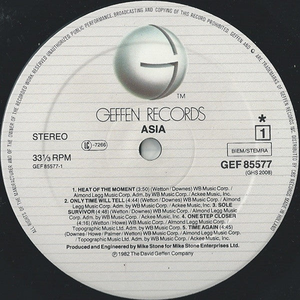 Made in Holland. Printed in Holland. Cat# 85577 on sticker on front cover, back cover and inner sleeve. Cat# GEF 85577 on labels. Cat# GHS 2008 on labels. Variant 2 has a round yellow sticker on the sleeve: Contains the hit single Heat Of The Moment ASIA is..... Runouts are stamped except for GHS • 1 • 2008 • CBS • HOLL • 3, GHS • 2 • 2008 • CBS • HOLL • 1, GHS • 1 • 2008 • CBS • HOLL • 3 C, GHS •1•2008•CBS • HOLL• 1 and GHS •2 •2008 •CBS •HOLL•2, which are etched. Similar to [r=369654 but with different price code.