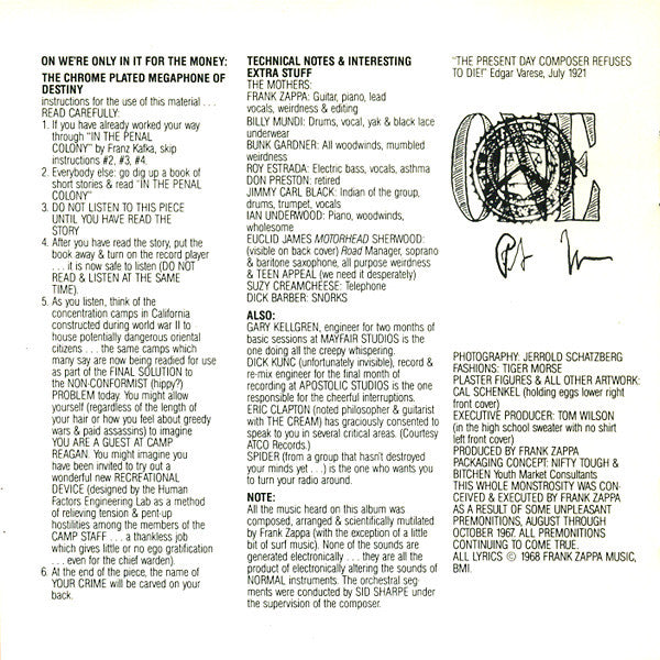 "All the music heard on this album was composed, arranged & scientifically mutilated by Frank Zappa (with the exception of a little bit of surf music). None of the sounds are generated electronically... they are all the product of electronically altering the sounds of NORMAL instruments."