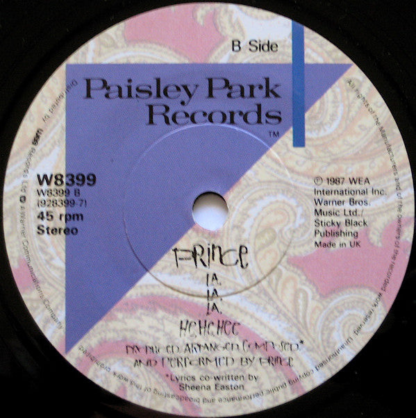Paper labels. <a href=>Silver injection label</a> pressing also available. Track A: Edited from the album WX 88 <a href=>Sign 'O' The Times'</a> A: Warner Bros. Music Ltd. B: Warner Bros. Music Ltd./.Sticky Black Publishing ℗ 1987 WEA International Inc. © 1987 WEA International Inc. Distributed by WEA Records Ltd. A Warner Communications Company. Made in UK.