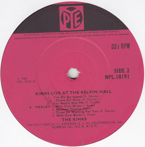 Album title Sleeve: "The Kinks Live At Kelvin Hall" Labels: "Kinks Live At The Kelvin Hall" Like all the original issues, A1 have wrong mention of "All Day And All Of The Night" instead of "Till The End Of The Day" curiously on label only : Other countries issues have the wrong title on cover AND label.