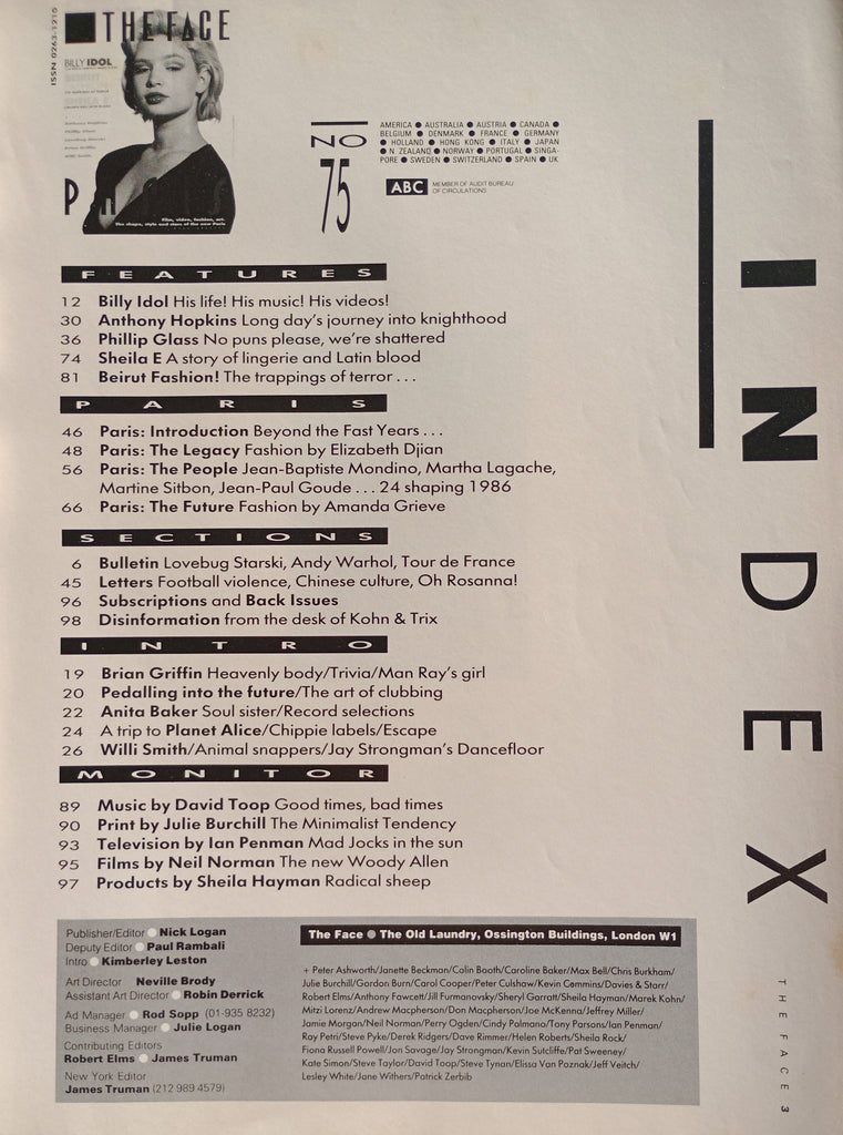 The Face Issue 75 July 1986 Billy Idol, Anthony Hopkins, Phillip Glass, Paris - 27 page special