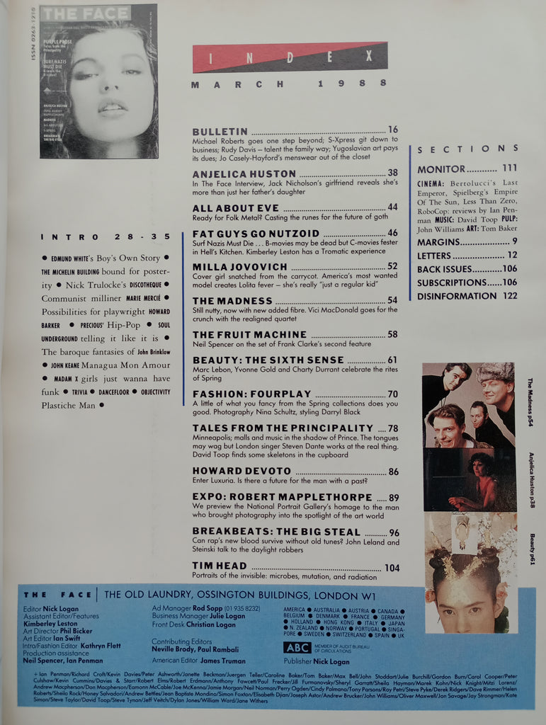The Face magazine #95 March 1988 Angelica Huston, Mill Jovovich, Howard Devoto