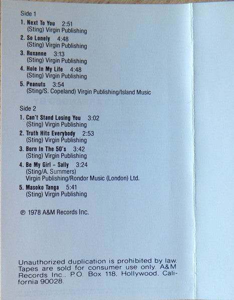 Clear plastic cassette with White transfer printing. The corresponding Red Paper Label version is [r=2893910 Publishers: Virgin Publishing (all tracks), Island Music (A5), Rondor Music (London) Ltd (B4) ℗ 1978 A&M Records Inc. (on inlay) This tape is mastered to Dolby B standards for noise reduction decrease treble when playing on units not equipped with Dolby playback circuits. Chromium dioxide 120 µs Stereo Dolby System B Nr