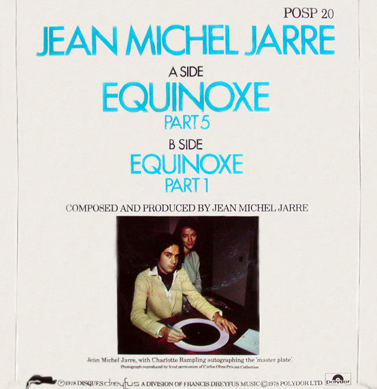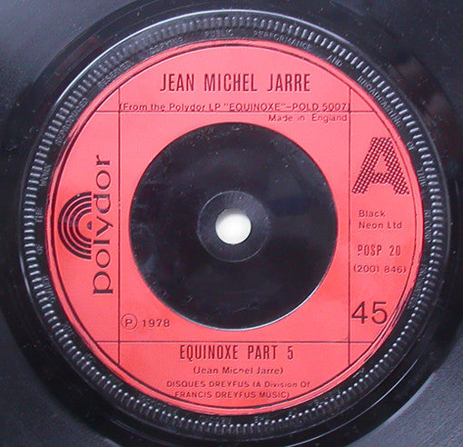 This release has red injection labels in a small hole vinyl record. Etched: on the 'B' side the word 'Equinoxe' is carved into the wax, along with Jean Michel Jarre's autograph, and the date - DEC '78. The back of the picture sleeve has a photo of this carving taking place. ℗ 1978 DISQUES Dreyfus a division of Francis Dreyfus Music © 1978 Polydor Ltd. From the Polydor LP "Equinoxe" POLD-5007. Made in England. Black Neon Ltd.