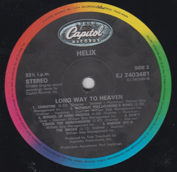 UK first pressing on black/rainbow rim Capitol Records label. Published by W. Seip Management, Inc.: tracks A1, A4, A5, B1 to B5 Published by W. Seip Management, Inc. / Screen Gems-EMI Music: tracks A2, A3 Produced for Hypnotic Productions Inc. Mixed at Electric Lady Studios, New York Recorded at Phase One Recording Studios, Toronto Ken Sinnaeve appears courtesy of Pressure Records Inc. Special Thanks To Anthony Boccongelle, Martin Sutton and Everyone at retail, radio, television, press and Capitol Records. This album is dedicated to You and to every individual who has contributed to making Helix what it is today. Although we are unable to list all of you in this short space, rest assured that in our hearts we are thinking of each and every one of you. ℗ © 1985, Capitol Records, Inc., 1750 North Vine Street, Hollywood, California 90028, U.S.A. You keep us rockin! Friends of Helix Club P.O. Box 577 Waterloo, Ontario N2J 4B8 Canada
