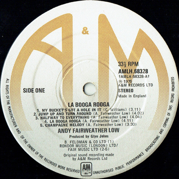 Issued in a single outer sleeve with an inner sleeve printed with lyrics and credits on one side and photograph on the other. First cat. # on the sleeve, second on the labels. [Record labels ℗ 1975 A&M Records Ltd. Made in England [Inner sleeve Printed in England ** © Copyright 1933 B. Feldman & Co. Ltd. ... (for A1) * © Copyright 1975 Rondor Music London Ltd. (for A2-B5) [Back cover Sleeve printed and made in England by MacNeill Press Limited ... Writing credit is given on back cover as "A.F.L.", on record labels as "A. Fairweather Low"