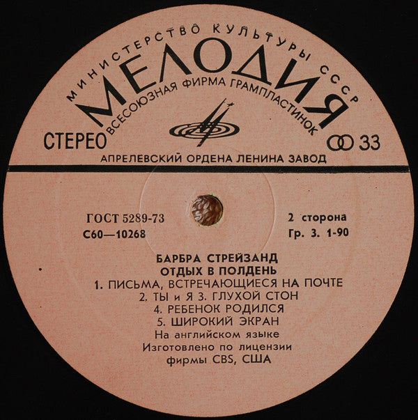 Барбра Стрейзанд* - Отдых В Полдень (LP, Album, Pin) (Very Good Plus (VG+))