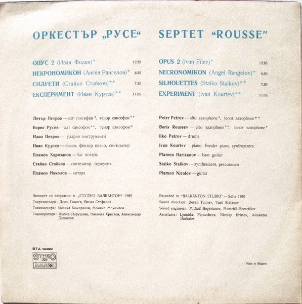 Tracklisting is in Russian on the labels. Artist on the labels: Оркестр „Русе“. Recorded in Balkanton Studio, Sofia 1980.