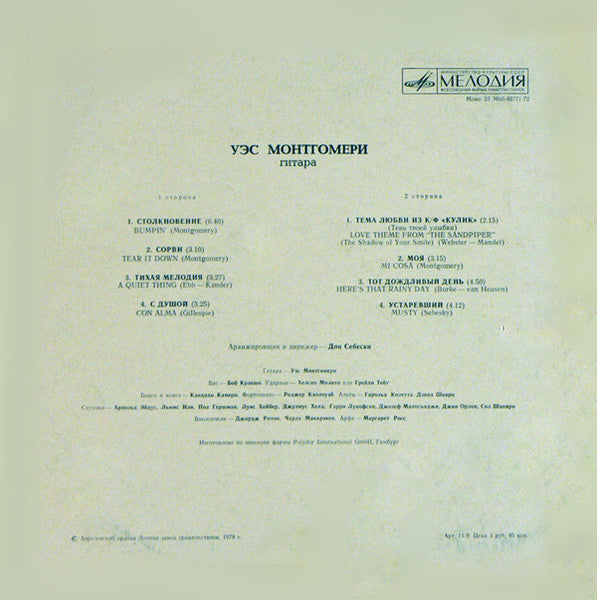 Original title of this album: Wes Montgomery – Bumpin' (originally released in 1965). Изготовлено по лицензии фирмы Polydor International GmbH, Гамбург. © Апрелевский ордена Ленина завод грампластинок. 1978 г.