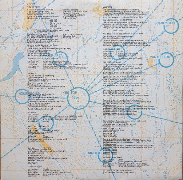[Back cover: Bottom right K 50518ⓢ (SD 19202) ([l681 logo) ℗ 1978 ATLANTIC RECORDING CORPORATION An Atlantic Recording distributed by [l43315 ([l22328 logo) A [l552180 Company Printed in England by [l271427, London SE9 2EQ [Spine notes YES/TORMATO | ATLANTIC RECORDS K 50518ⓢ [Vinyl inner sleeve, SIDE ONE [Bottom right All Lyrics © 1978 All rights Reserved (For Publishing Information see label.) [Vinyl inner sleeve, SIDE TWO [Top left K 50518ⓢ [Bottom left All Lyrics © 1978 All rights Reserved (For Publishing Information see label.) [Bottom right All tracks arranged and produced by YES Recording engineers [a171127 and [a287356 Assisted by [a173021 and [a79510 [a1311087 arrangement and orchestration on "Onward" and string arrangement on "Madrigal" from an original ideal by [a149420 Disc cutting Sean Davis at Strawberry Studios, London Recorded at [l265265, London Mixing and additional recording at [l269875, London Executive producer 'we owe it all to' Brian Lane Special thanks to: Jake Berry, Sandy Camppell, Toby Errington, Pat Fairley, Jacki Field, Brenda Franklin, Jim Halley, Ray Jones, John Martin, Michael Tait, Claude Johnson Taylor, Nu Nu Whiting, and all the Garys from South Shields who have been with us through "ten true sommers long". Sleeve design by Hipgnosis | Photography Hipgnosis/Brimson Graphics Colin Elgie YES logo designed by Roger Dean [a149420 appears courtesy of [l904 Thanks to Damion James for being "a chip off the old block" on "Circus Of Heaven" [a50263 Tor is situated two-and-a-half miles from Okehampton, Devon in England, on a clear day, from the top, you can see far away places with strange sounding names. [Disc label both sides as single line runout All rights of the Manufacturers and of the owners of the recorded work reserved. Unauthorized copying public performance and broadcasting of this work prohibited. Distributed by wea Records Ltd., 20, Broadwick St. London W.1. a [l552180 Company ([l22328 logo) [Disc label notes left STEREO SIDE ONE | SIDE TWO [Disc label both sides right K 50518 SD 19202 ℗ & © 1978 [Disc label both sides bottom middle after the tracks and composer notes Arranged & Produced by Yes Topographic Music-Warner Bros. Music Ltd./ Side A: Rondor Music (1 & 4) Topographic Music-Warner Bros. Music Ltd. (2, 3 & 5) Side B: Rondor Music (1) Topographic Music-Warner Bros. Music Ltd. (2, 3 & 4) ([l681 logo) Durations do not appear on this release.
