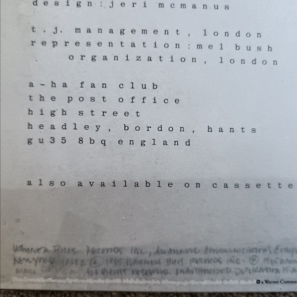 Similar to release but with different matrices. Comes with a printed inner sleeve. Note the different text around the edges of the labels. And the "scrubbed out" legal text at the bottom of the album (see photo). Printed on the labels: ℗ + © 1985 Warner Bros. Records Inc.for the U.S. & WEA International Inc. for the world outside of the U.S. Printed on the inner sleeve: UK: WX30 © 1985 warner bros. records inc. Photo: Larry Williams Printed on the back cover: [Warner logo a Warner Communications Company. Debossed Warner logo