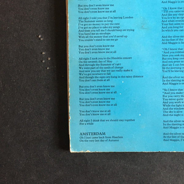 Back cover and matrix variation. Very similar to [r1141664. Beside the matrix differences, the major difference is on the back cover. The lyrics for Amsterdam start on column 1 for this release. On [r1141664 Amsterdam lyrics start in column 2. Orange CBS "walking Eye" labels. 1st Cat on sleeve, 2nd on labels. Produced at Trident Sound Studios Shorepak by Shorewood Packaging Co. Ltd., England. Publishing info - A1 to A4, B2 to B4: Gwyneth Music Ltd. B1: Kinney Music Ltd. Made in England ℗ 1972