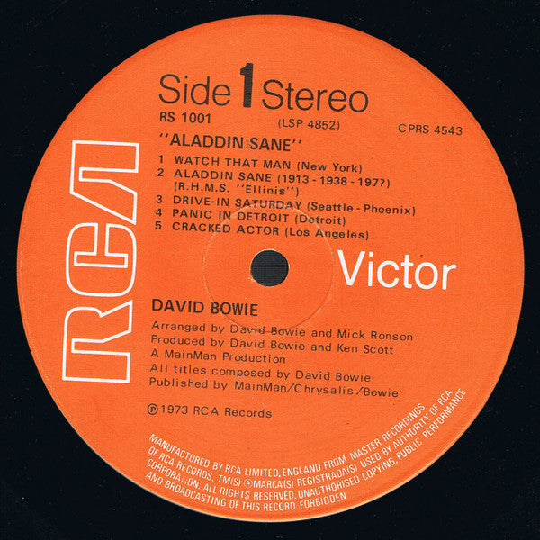 UK non-gatefold release Pressing variant with [a785478 mastering, identified by "DAVE" etched in runouts. Label variant with credits for side 2 tracks 1, 4, & 5 all reading "MainMan/Chrysalis /Bowie". "Stereo" at top of label.