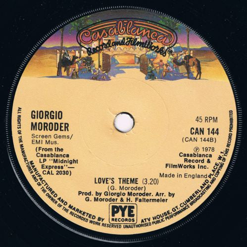Both tracks taken from the 1978 LP. This single was released on Friday 2nd March 1979. It entered the UK Singles chart later in March 1979, and peaked at Number 48 in the last week of March 1979. From the Casablanca LP "Midnight Express" - CAL 2030 ℗ 1978 Casablanca Record & Filmworks Inc. Made In England.