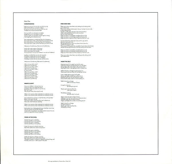 Comes with a printed lyrics inner sleeve. [Sleeve ©1984 A [WEA logo Recording. Manufactured in Germany by Record Service GmbH, Alsdorf Pressé en Allemagne par Record Service GmbH, Alsdorf [W logo a Warner Communications Company. [Inner sleeve All songs published by Warner Bros. Music Ltd. [Label side A * 1-5 Warner Bros. Music Ltd. ℗ 1983 (2) ℗ 1984 (1, 3, 4, 5) WEA Records Ltd. * G.B. only [Label side B * 1-5 Warner Bros. Music Ltd. ℗ 1983 (1) ℗ 1984 (2, 3, 4, 5) WEA Records Ltd. * G.B. only [Labels Made In Germany Ny WEA Musik GmbH A Warner Communications Company GB: WX1 there also exists a version similar to this one, but with different price codes:[r16365270