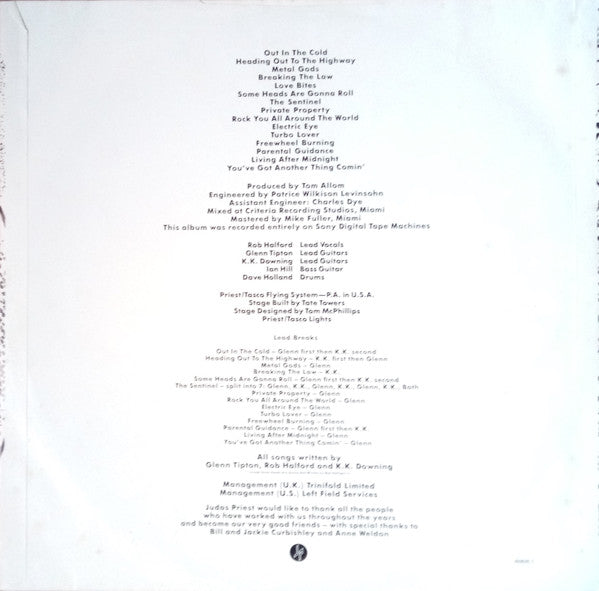 Mixed at Criteria Recording Studios, Miami © 1987 CBS Inc. Made in England. Interpak II by Shorewood Packaging Co. Ltd, England Issued in a gatefold sleeve with printed inner sleeves.