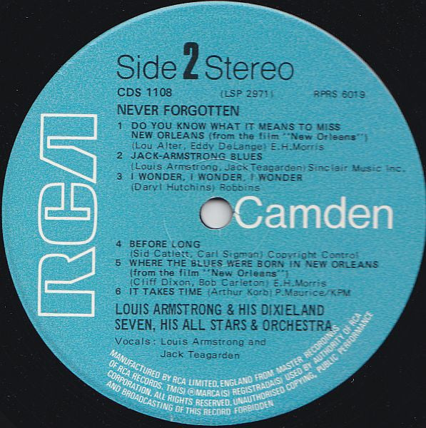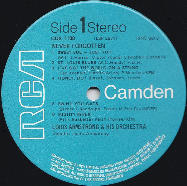 Artist on sleeve: Louis Armstrong Artist on A-side label: Louis Armstrong & His Orchestra Artist on B-side label: Louis Armstrong & His Dixieland Seven, His All Stars & Orchestra Manufactured by RCA Limited, England from master recordings of RCA Records. Manufactured by RCA Ltd for Pickwick International Inc (GB) Ltd Made in England